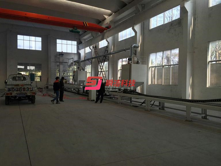 小口徑的鋼管使用內(nèi)壁噴丸機(jī),鋼管內(nèi)壁噴丸處理線,主要包括移動(dòng)臺(tái)車,砂斗,噴砂罐,噴槍,噴槍承載車,鋼管承載系統(tǒng),底部彈丸輸送皮帶機(jī),斗提機(jī),維修平臺(tái),分離器,除塵系統(tǒng),支架,氣動(dòng)系統(tǒng),壓縮空氣系統(tǒng),電控系統(tǒng)。